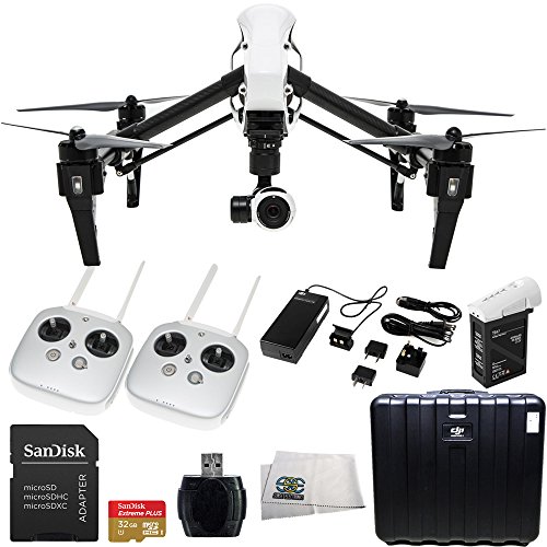 Capture 4K video and take 12-megapixel still photos from the air with the DJI Inspire 1 Quadcopter with Integrated Camera and 3-Axis Gimbal. Forgoing the fixed landing gear design found on many earlier quadcopters, the Inspire 1 features a retractable arm system whereby the underside of each prop motor has a foot to act as a landing pod when the arms are lowered. In-flight, the arms lift up to provide the camera an unobstructed 360-degree view. A 3-axis gimbal keeps shots steady and the camera pointed the same direction as the quadcopter banks and turns. The camera records internally to microSDHC/SDXC memory cards (16GB inlcuded) and can also beam a live 720p feed to a mobile device running the DJI Lightbridge app or a monitor or FPV glasses with an HDMI input. Two transmitters (radio controllers) are included so that one operator can pilot and another can pan and tilt the camera.